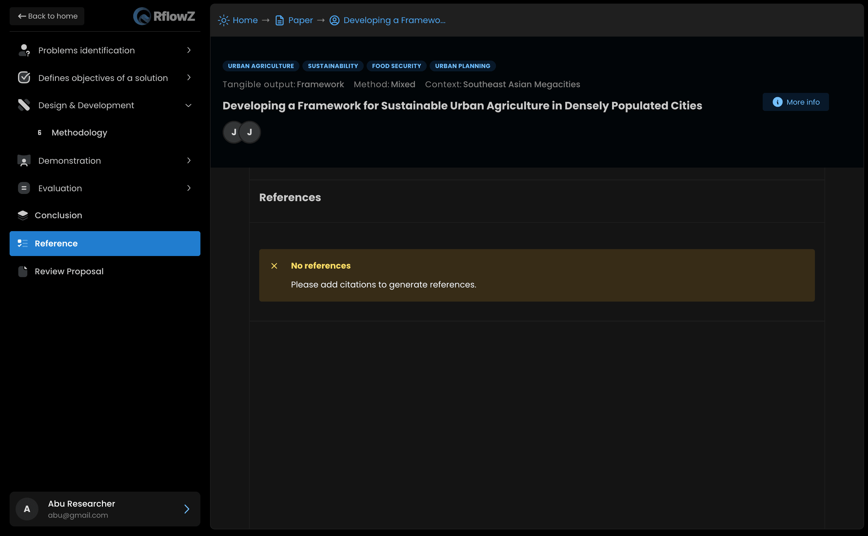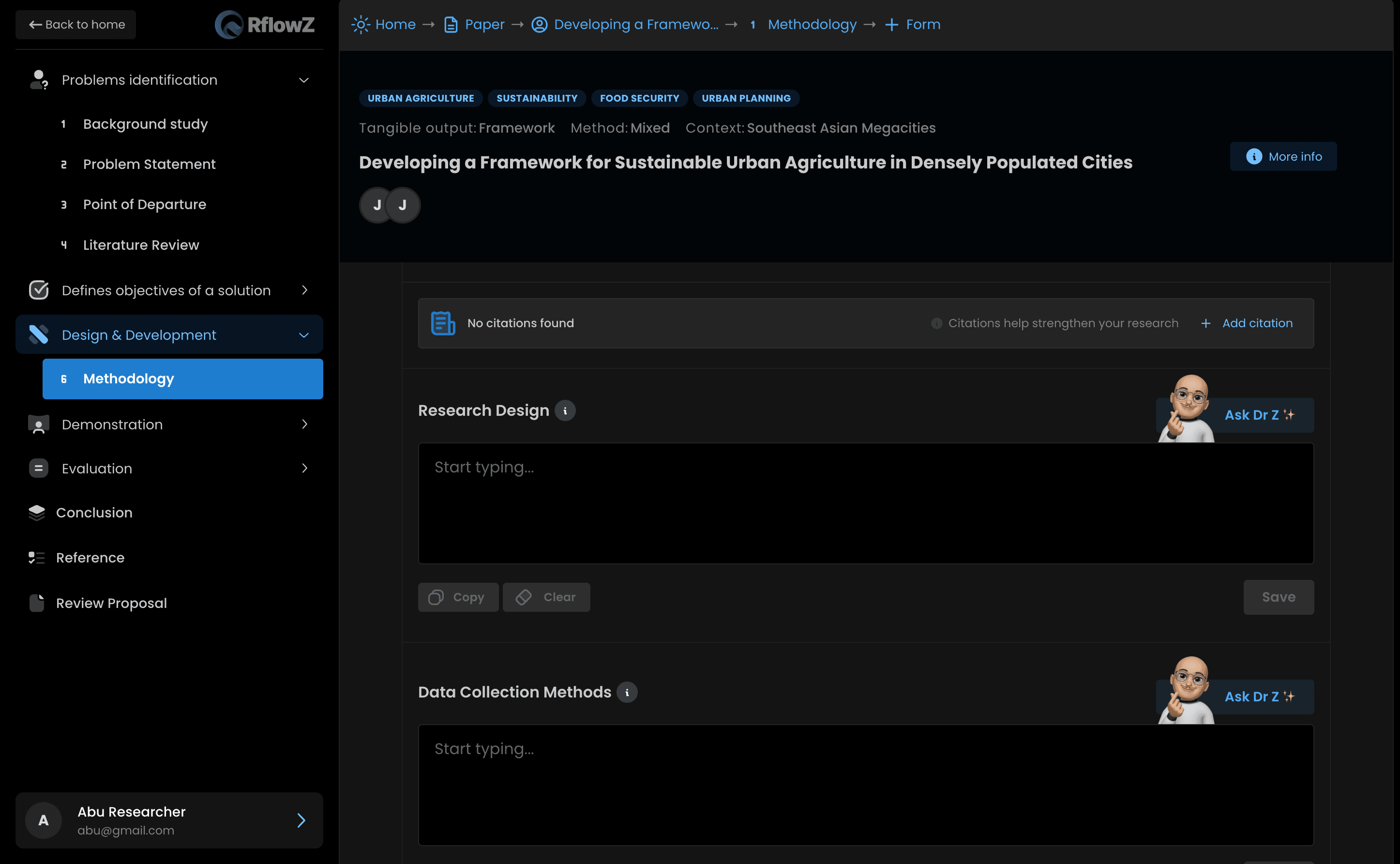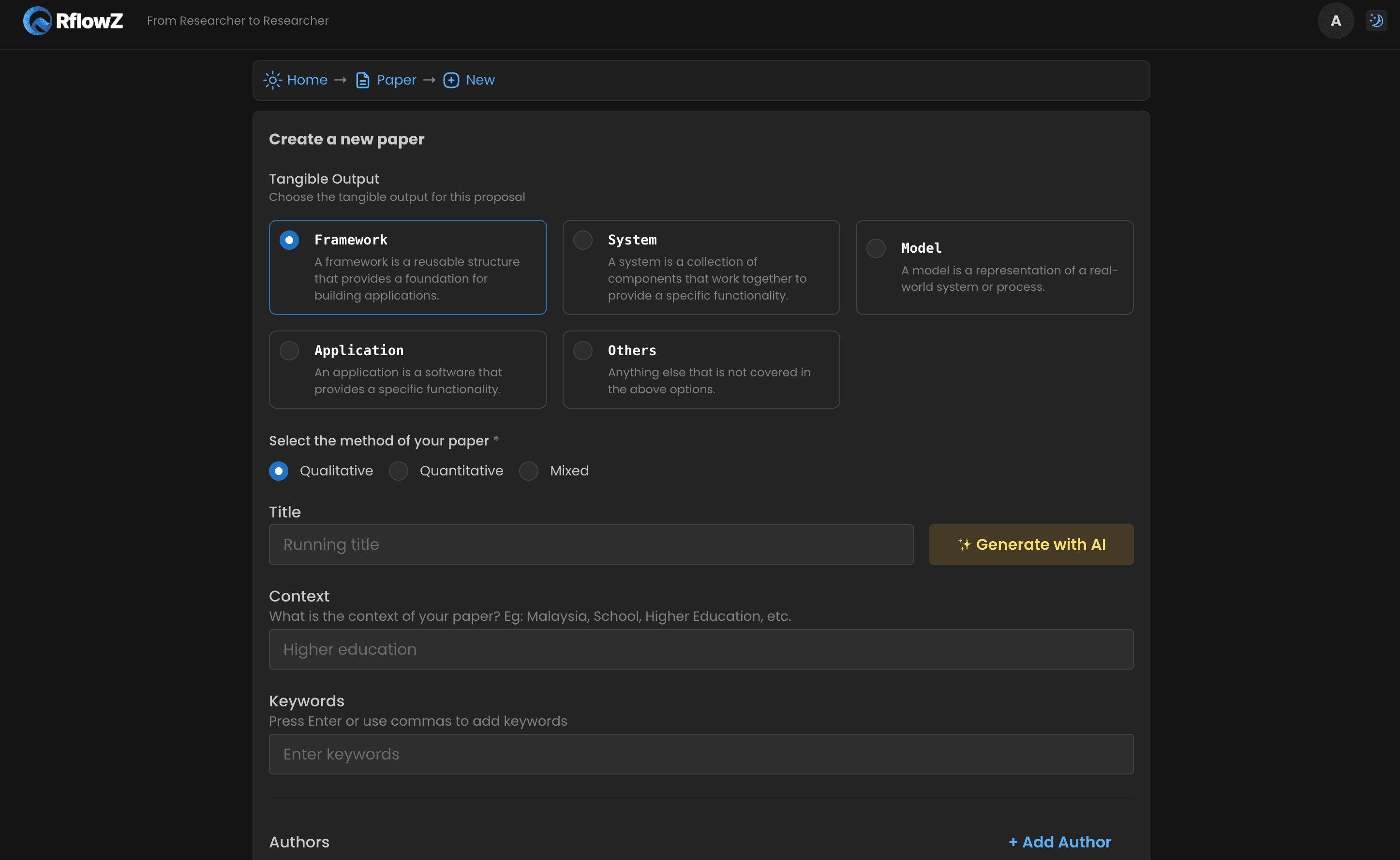 RflowZ is a web application designed to simplify the process of writing research proposals. It offers AI-powered writing assistance, customizable templates, and seamless citation management by integrating with Mendeley, helping you focus more on your research and less on formatting or tedious tasks.