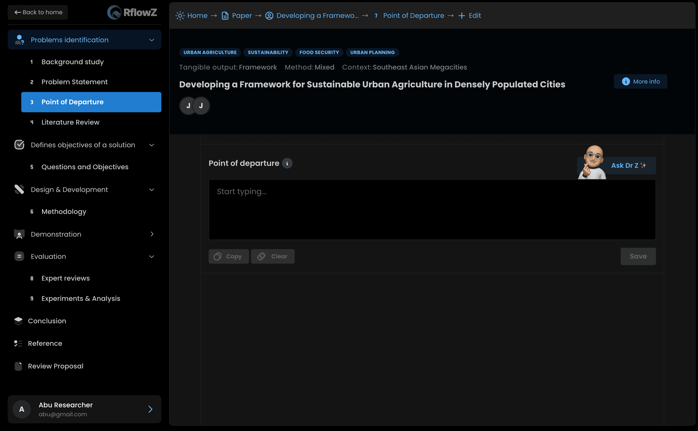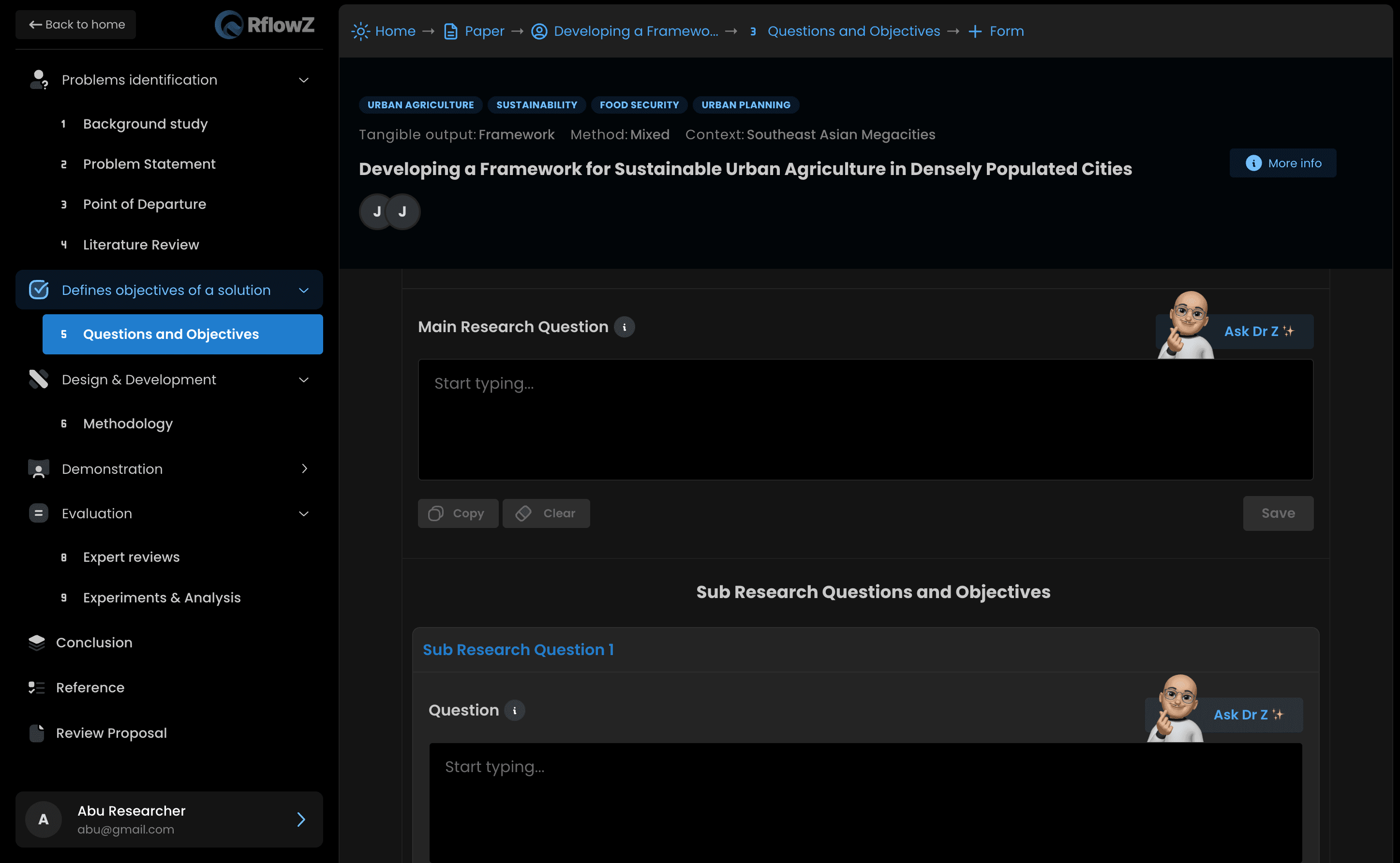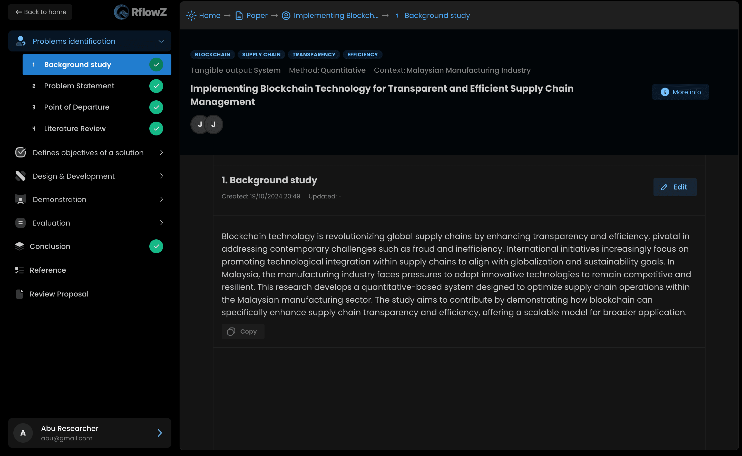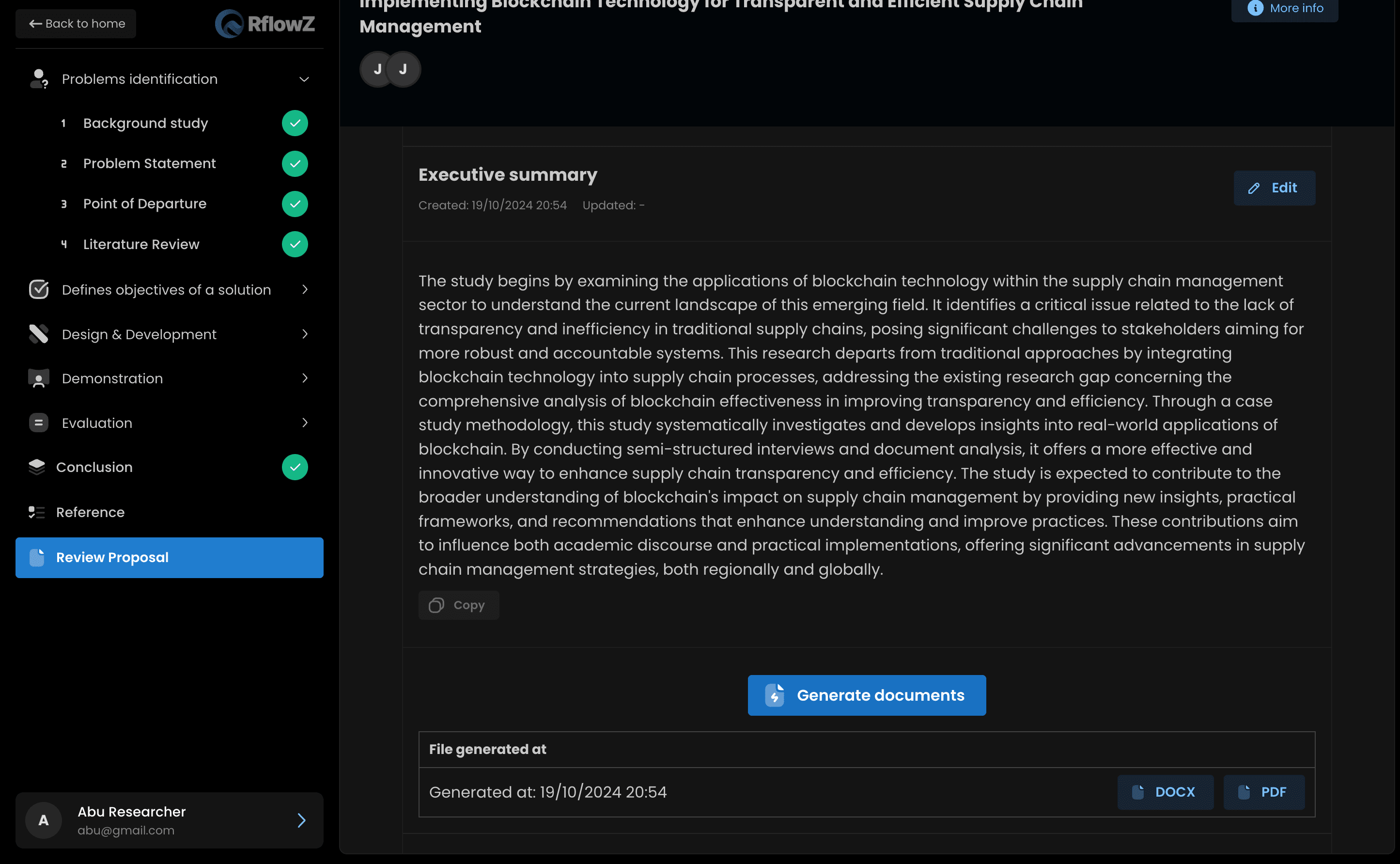 RflowZ is a web application designed to simplify the process of writing research proposals. It offers AI-powered writing assistance, customizable templates, and seamless citation management by integrating with Mendeley, helping you focus more on your research and less on formatting or tedious tasks.